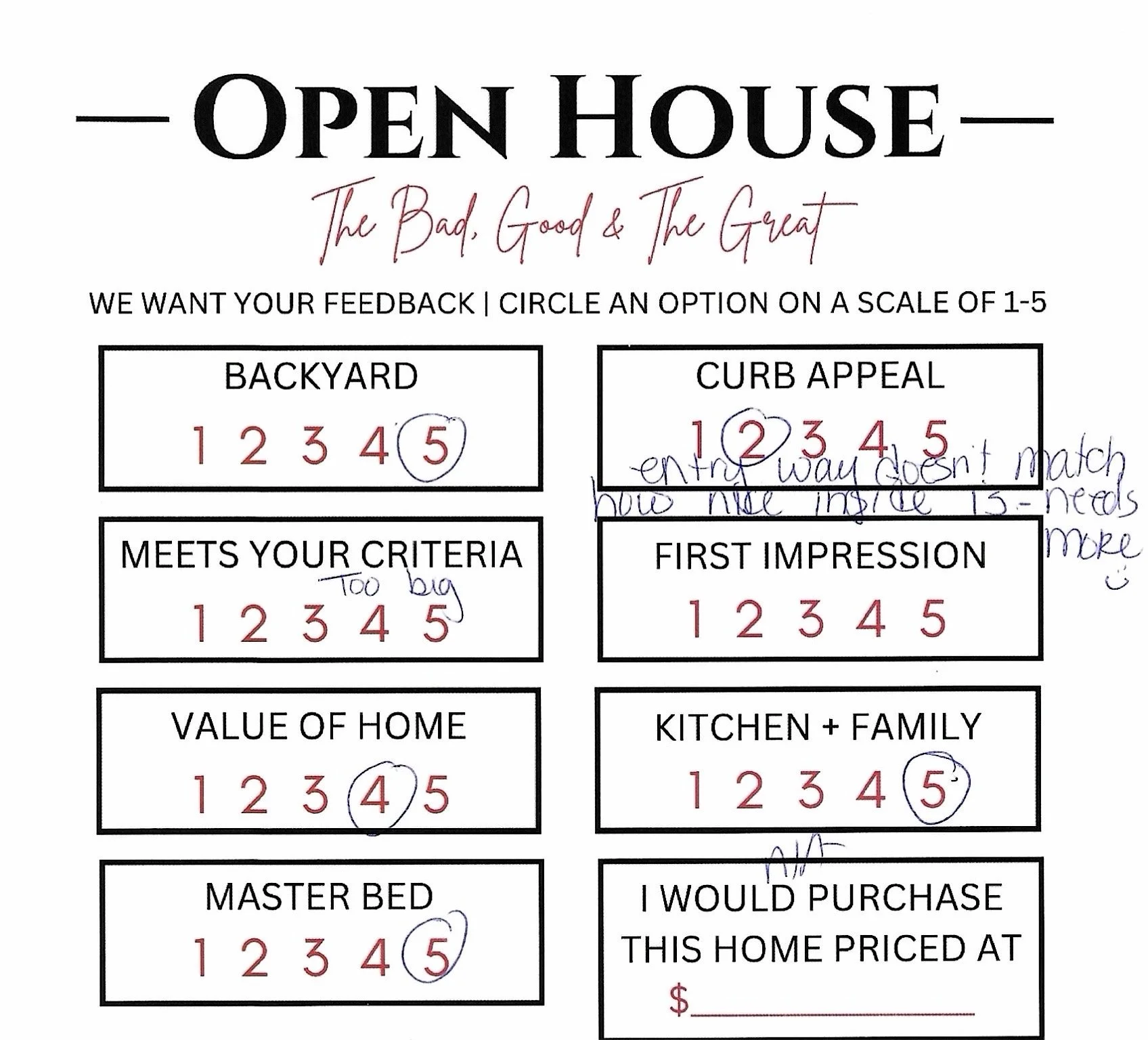 6 groups, Too big of a home for some, āentry way doesnāt match how nice the inside is-needs moreā, in person was much better than the pictures. Nice Casita, didnāt like that you could see the neighbors in the backyard, someone was very interested in the observatory.